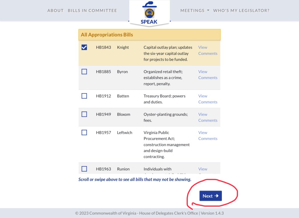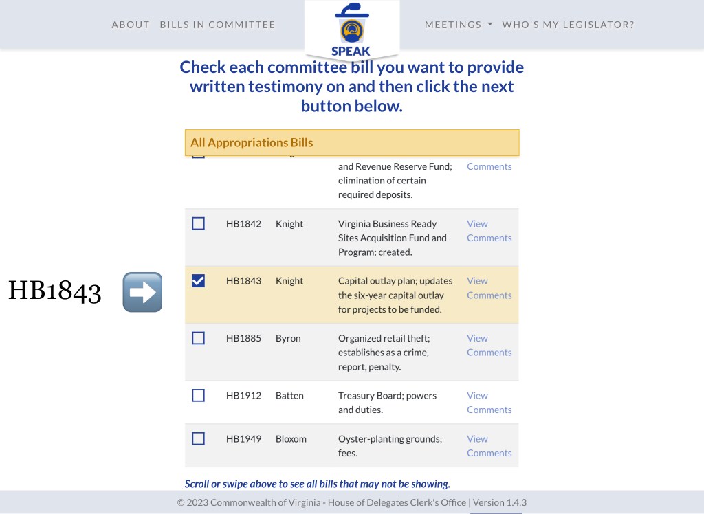 Start here to view YOUR “Public Comments for: HB1843 – Capital outlay plan; updates the six-year capital outlay for projects to be funded.” so far. https://hodspeak.house.virginia.gov/committees/H02/bills/HB1843/comments (opens in new tab)